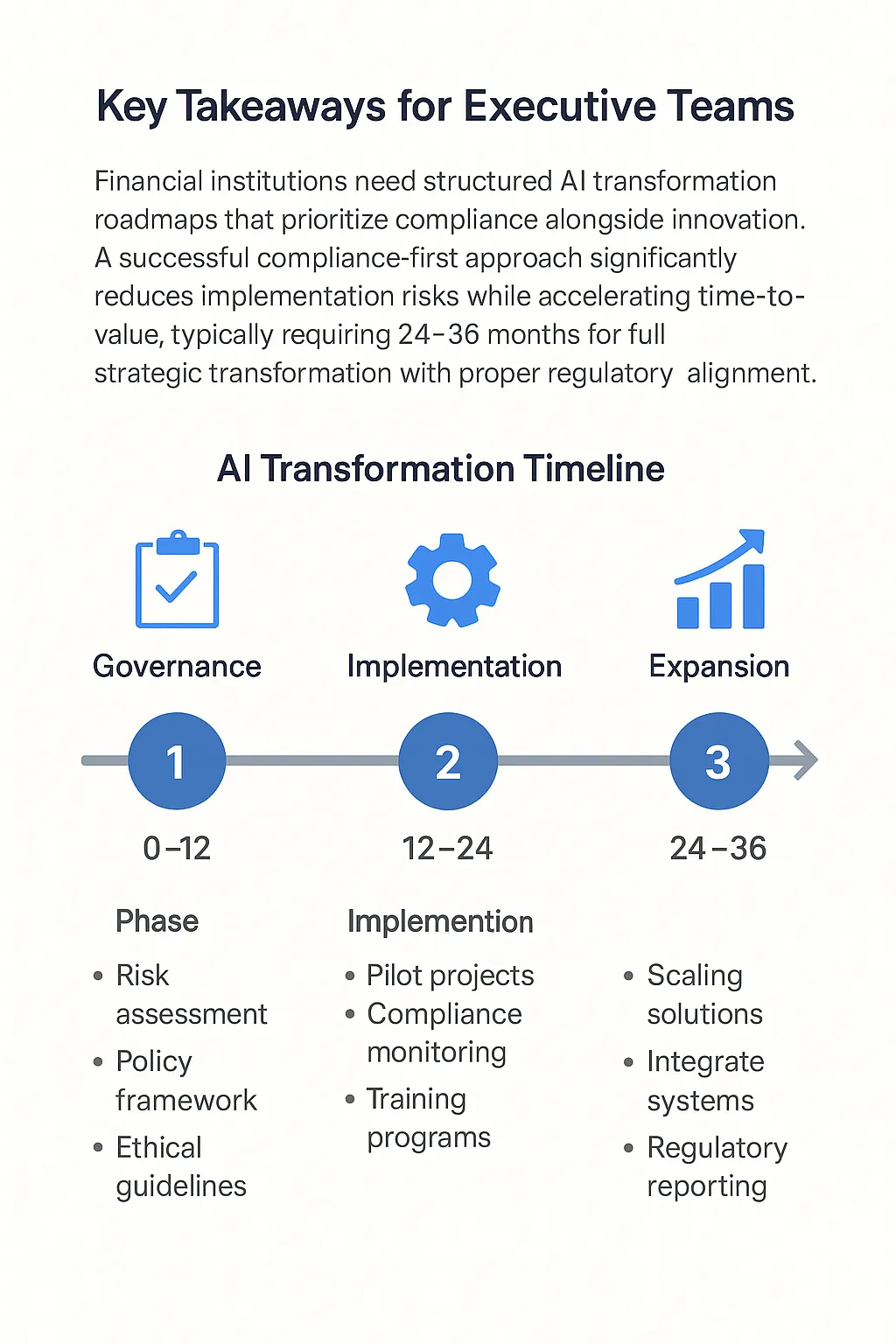 Financial institutions need structured AI transformation roadmaps that prioritize compliance alongside innovation. A successful compliance-first approach significantly reduces implementation risks while accelerating time-to-value, typically requiring 24-36 months for full strategic transformation with proper regulatory alignment.