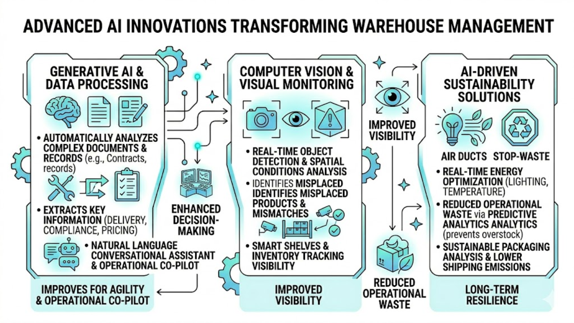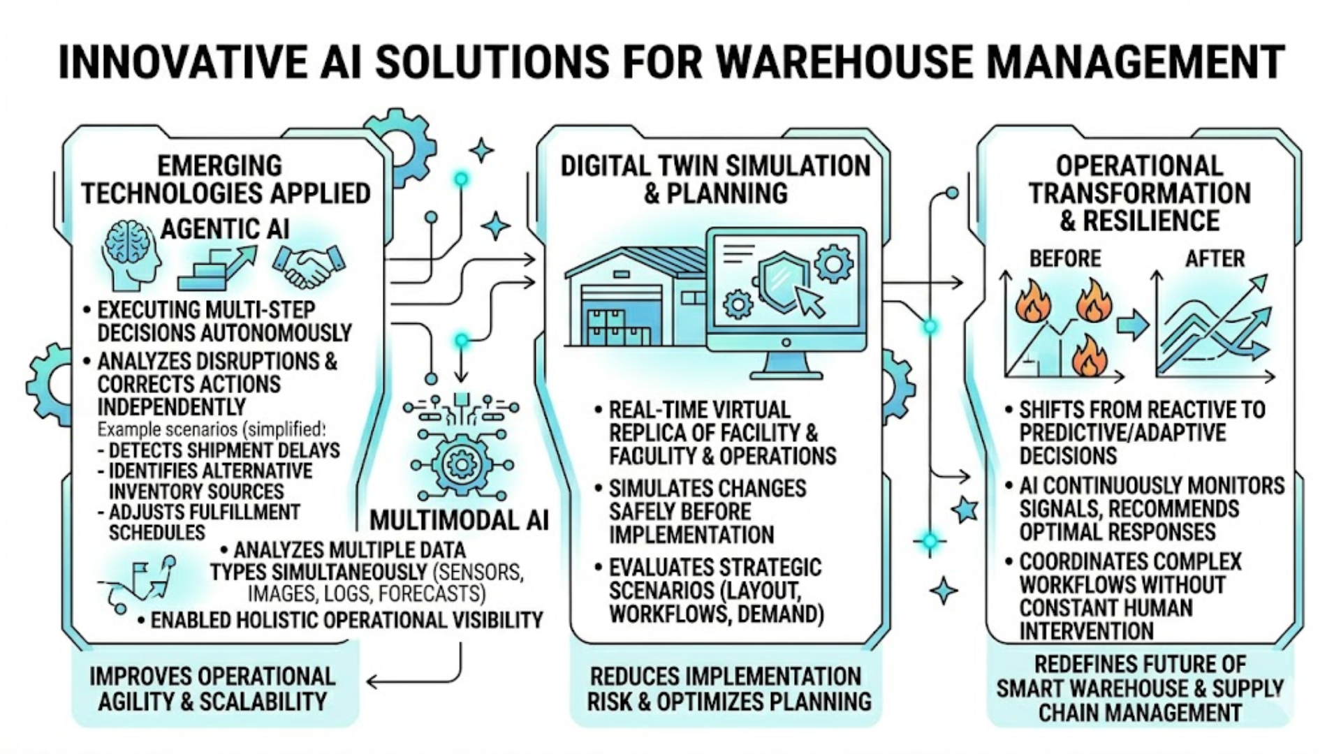 Innovative AI solutions enable warehouses to shift from reactive operations to predictive and adaptive decision-making. Instead of responding to disruptions after they occur, AI systems continuously monitor operational signals and recommend optimal responses in advance. This capability strengthens resilience and improves long-term operational stability.