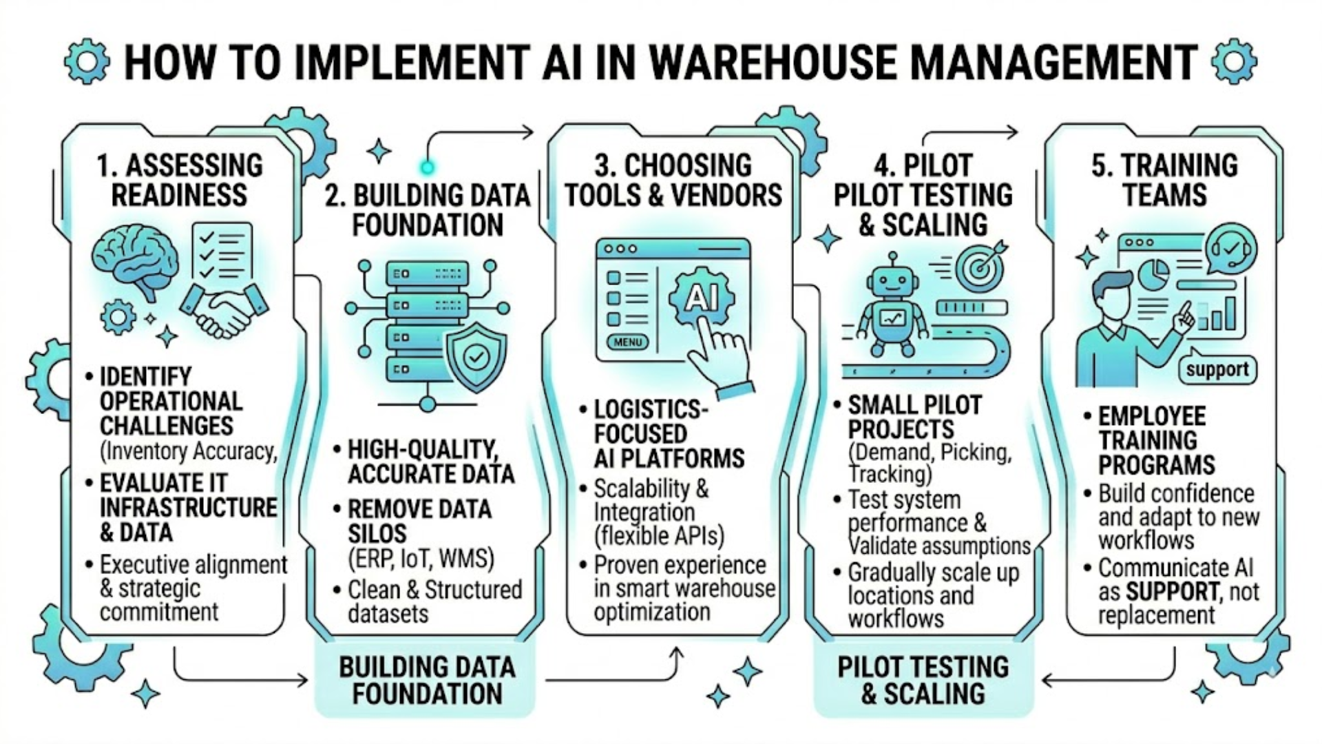 Implementing AI use cases in Warehouse Management requires a structured approach that aligns technology with business goals. Companies should focus on data readiness, system integration, and workforce adoption to ensure long-term success. A phased implementation strategy helps reduce risk while enabling scalable AI warehouse automation.