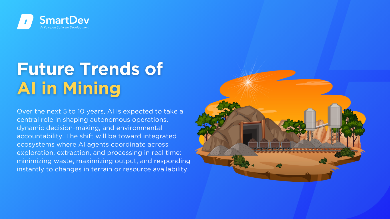 As AI continues to evolve, the mining industry is set to undergo a transformation that goes beyond automation into truly adaptive and self-optimizing systems. Over the next 5 to 10 years, AI is expected to take a central role in shaping autonomous operations, dynamic decision-making, and environmental accountability. The shift will be toward integrated ecosystems where AI agents coordinate across exploration, extraction, and processing in real time: minimizing waste, maximizing output, and responding instantly to changes in terrain or resource availability.
