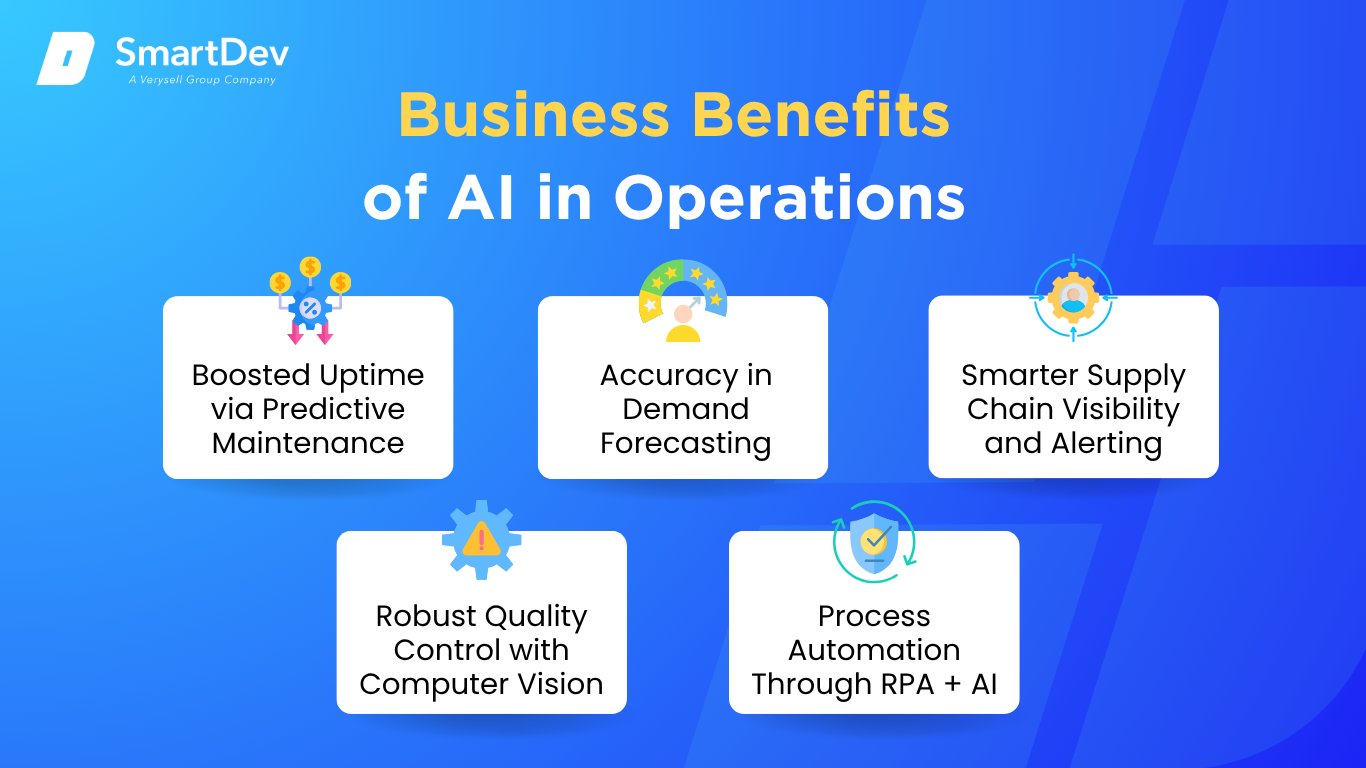AI delivers measurable operational value by addressing core pain points: inefficiency, high operational cost, process delays, and quality variability. Below are five key benefits driving business value today.