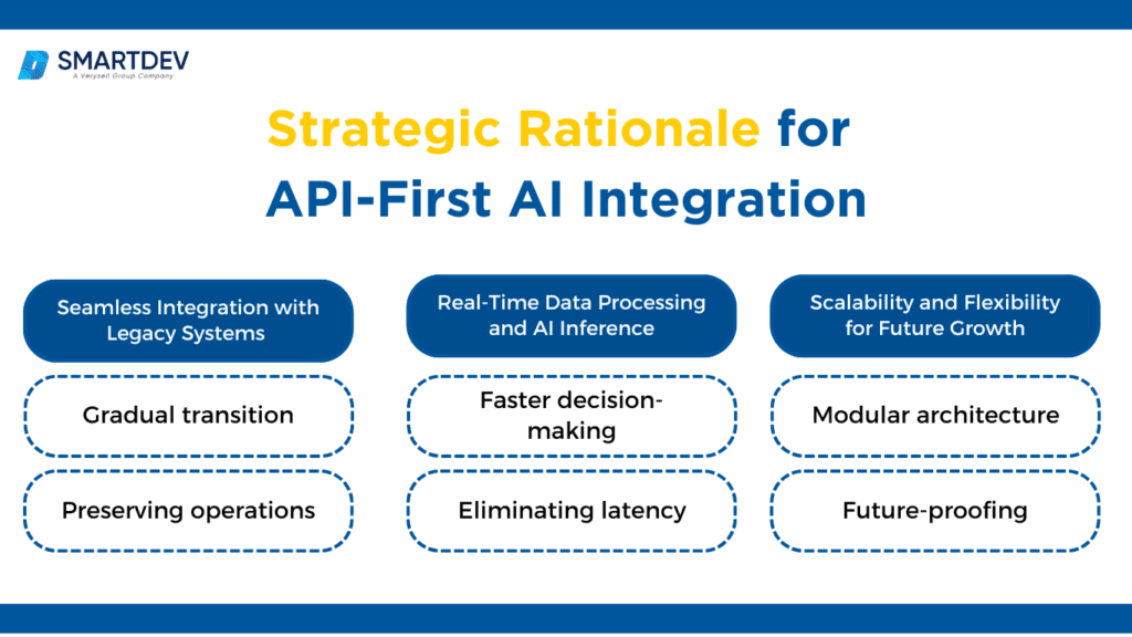 Many organizations still use legacy systems that were not built to handle modern AI technologies. Replacing these systems entirely is expensive and disruptive. The API-first approach helps businesses avoid this by enabling incremental integration of AI models into their existing systems.