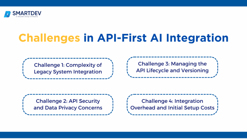 While the API-first approach offers many benefits for integrating AI models with existing systems, there are several challenges that organizations must address. These challenges can make the implementation process more complex. Below, we discuss the key obstacles businesses face when adopting API-first AI integration and how to approach them.