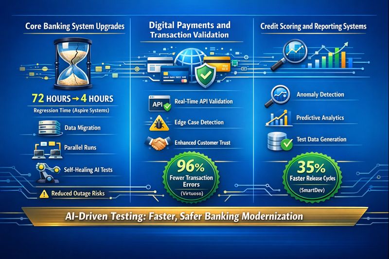 Predictive defect analytics identify high-risk areas before release, allowing teams to focus effort where failures would be most costly. Continuous compliance validation ensures regulatory rules are enforced consistently across environments. According to ImpactQA, AI-driven testing can reduce test maintenance effort by up to 60 percent in banking applications while improving release speed and overall quality.