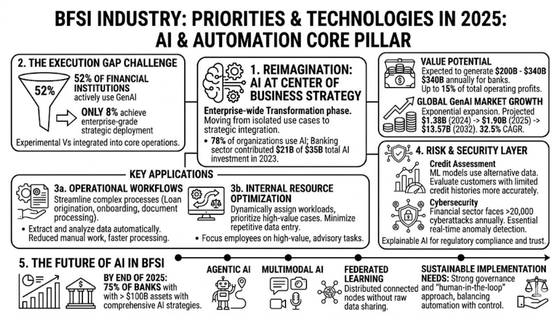 Artificial Intelligence (AI) is no longer an experimental layer in the BFSI sector. In 2025, it marks a structural turning point where banks shift from isolated use cases—such as basic chatbots or simple dashboards—toward enterprise-wide transformation. This new phase, often described as “Reimagination,” positions AI at the center of business strategy.