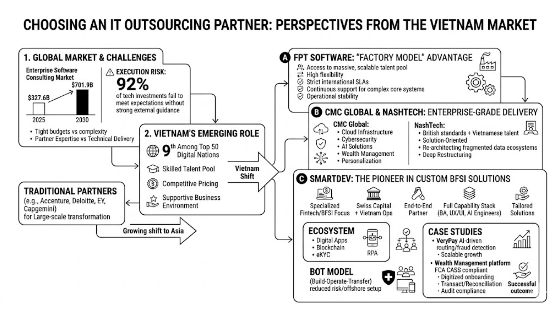 Traditionally, financial institutions rely on Tier-1 consultancies such as Accenture, Deloitte, EY, and Capgemini for large-scale transformation. However, to optimize cost and speed, a growing shift toward Asia—particularly Vietnam is clearly underway.