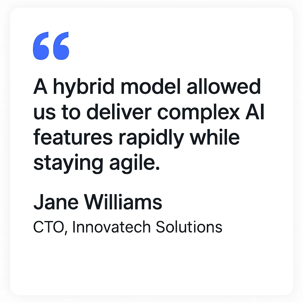 Outsourcing select AI components to vetted specialists can reduce end-to-end delivery time and lower total project costs. A hybrid approach—keeping core IP in-house while outsourcing complex AI components—often yields the highest speed and flexibility for resource-constrained startups.