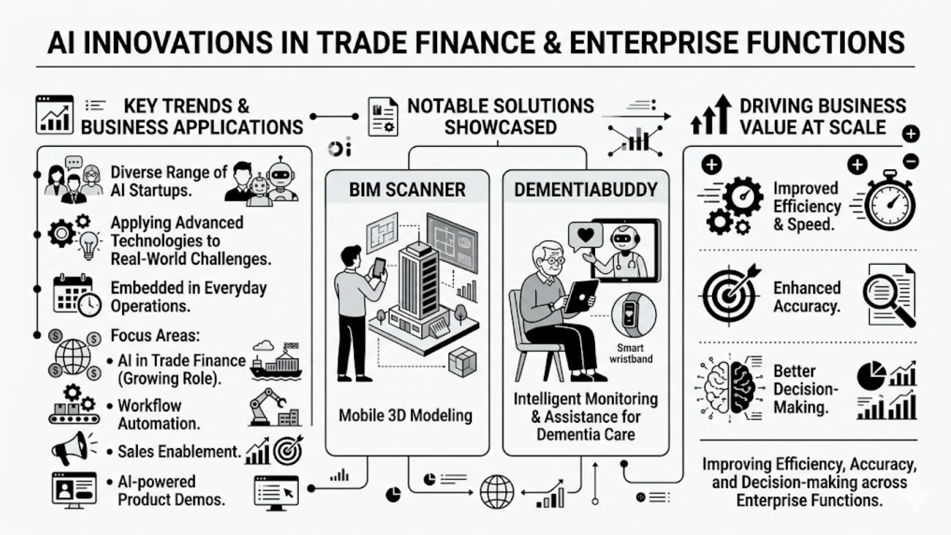 The event featured a diverse range of AI startups applying advanced technologies to real-world business challenges, including innovations relevant to AI in Trade Finance. Notable solutions included BIM Scanner for mobile 3D modeling and DementiaBuddy, a platform designed to support dementia care through intelligent monitoring and assistance.