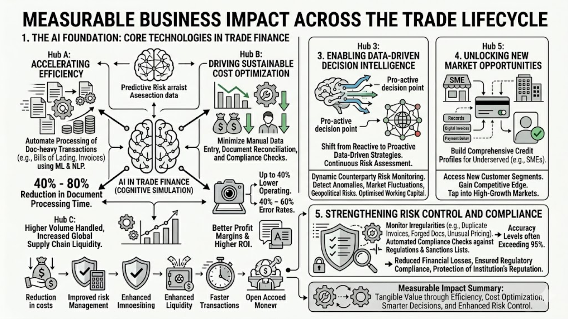 The adoption of intelligent technologies is delivering measurable impact across the trade lifecycle. Beyond theoretical potential, AI in Trade Finance creates tangible value through efficiency, cost optimization, smarter decision-making, and enhanced risk control.