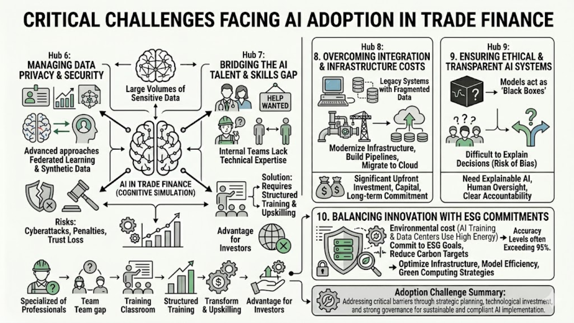 While the advantages are clear, organizations must address several critical barriers before they can fully realize the potential of AI in Trade Finance. These challenges require strategic planning, technological investment, and strong governance to ensure sustainable and compliant implementation.