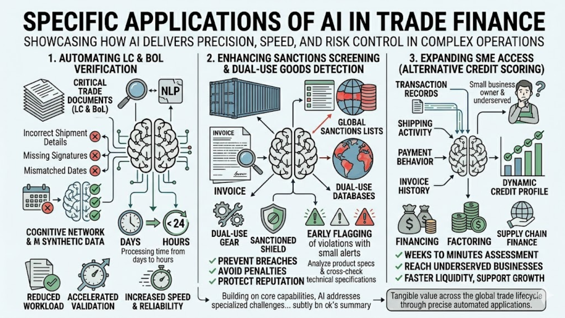 Building on its core capabilities, AI in Trade Finance addresses highly specialized challenges across the global trade lifecycle. These applications demonstrate how AI delivers precision, speed, and risk control in complex financial operations.