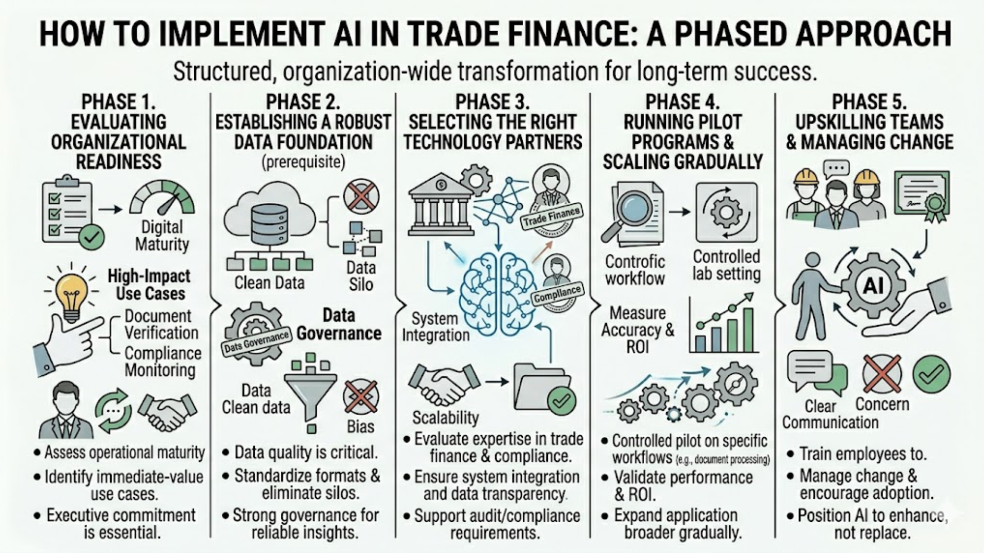 Adopting AI in Trade Finance requires more than deploying new technology, it demands a structured, organization-wide transformation. Financial institutions must follow a phased approach to minimize risk, align with business goals, and ensure long-term success.