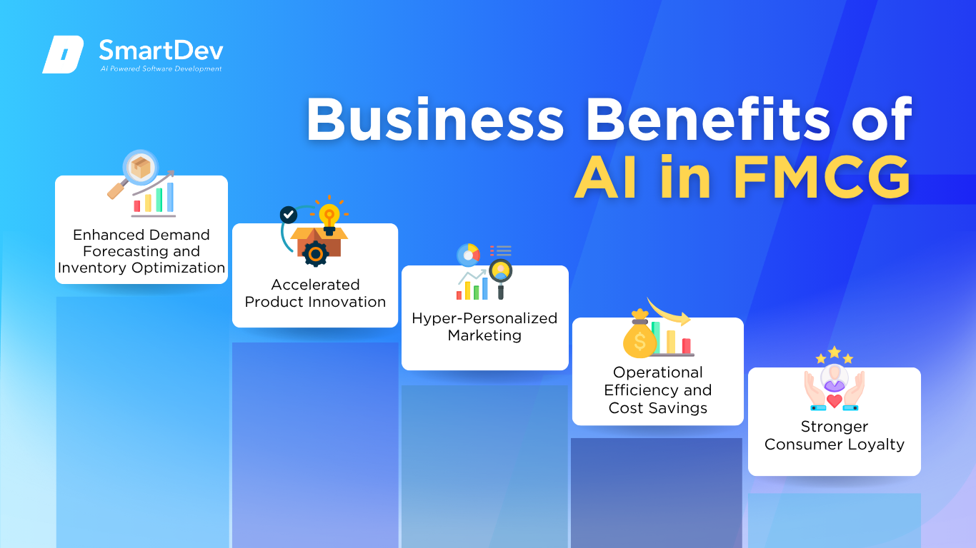 AI is solving critical business challenges in the FMCG sector, ranging from supply chain inefficiencies and lost revenue from poor forecasting to low ROI in marketing spend. Below are five key benefits where AI delivers tangible, enterprise-level value: