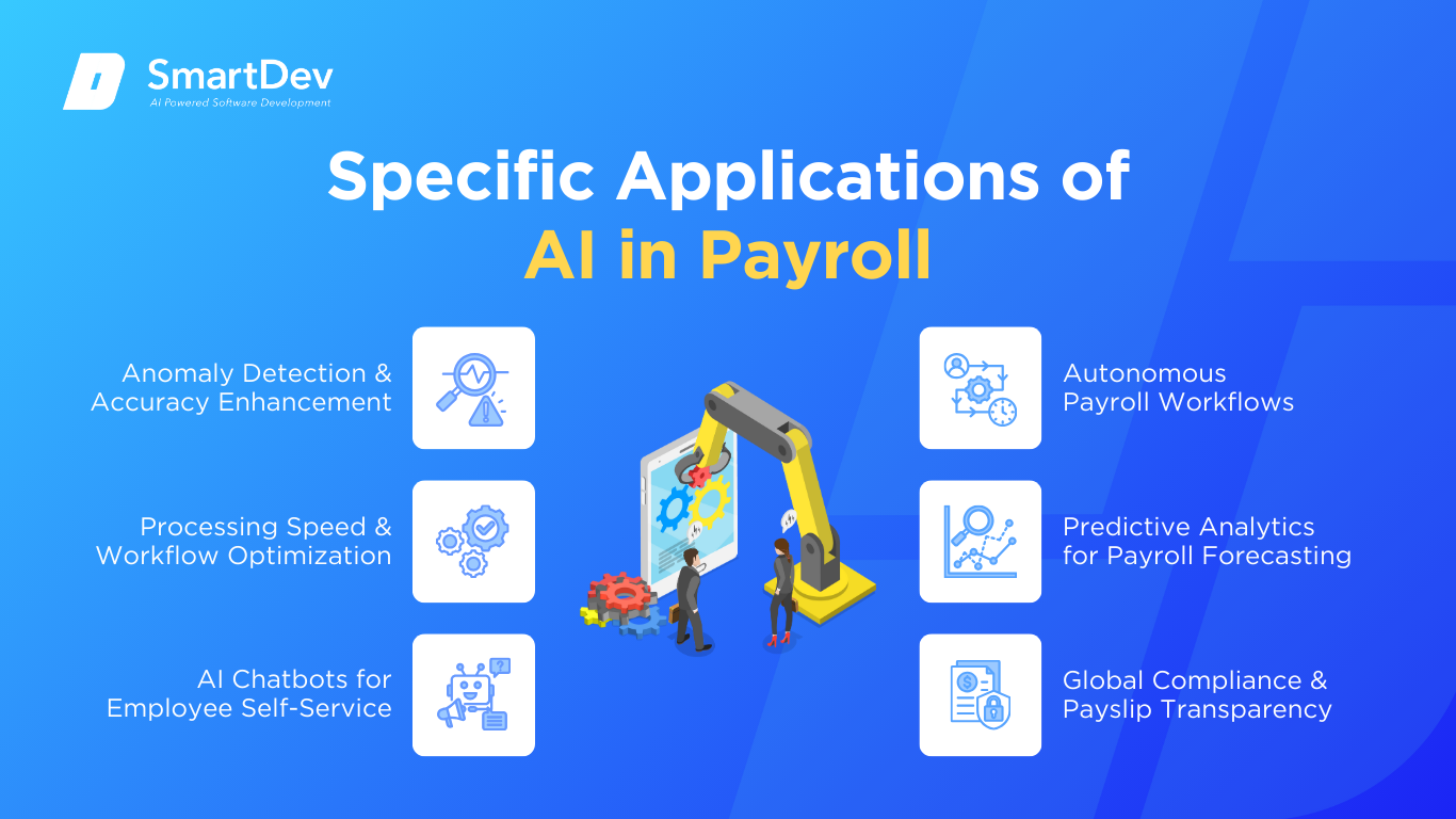 AI automates compliance monitoring across multiple regions by continuously updating tax rules, labor laws, and jurisdiction-specific policies. These systems ensure accurate tax withholding, benefits administration, and country-specific reporting. AI also generates self-explaining payslips, making deductions and benefits clear to employees.