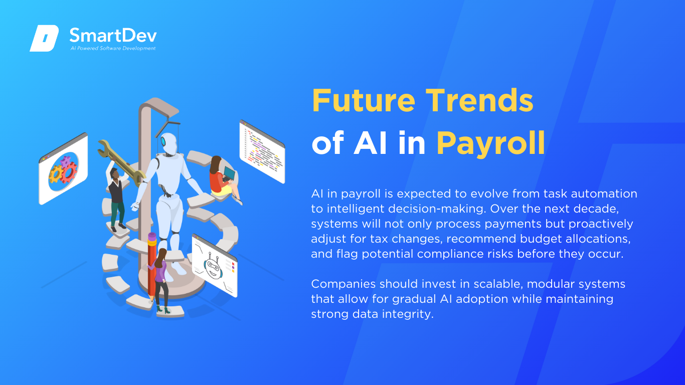 AI in payroll is expected to evolve from task automation to intelligent decision-making. Over the next decade, we’ll see systems that not only process payments but proactively adjust for tax changes, recommend budget allocations, and flag potential compliance risks before they occur. These tools will become more adaptive, using continuous learning to fine-tune payroll operations in real time.