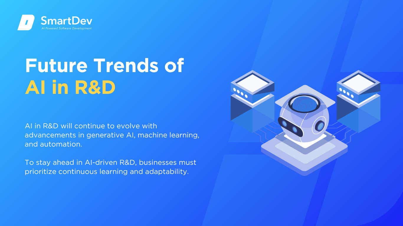 AI in R&D will continue to evolve with advancements in generative AI, machine learning, and automation. As AI becomes more autonomous, it will handle tasks like hypothesis generation, experiment design, and data analysis, speeding up innovation and improving accuracy in research.