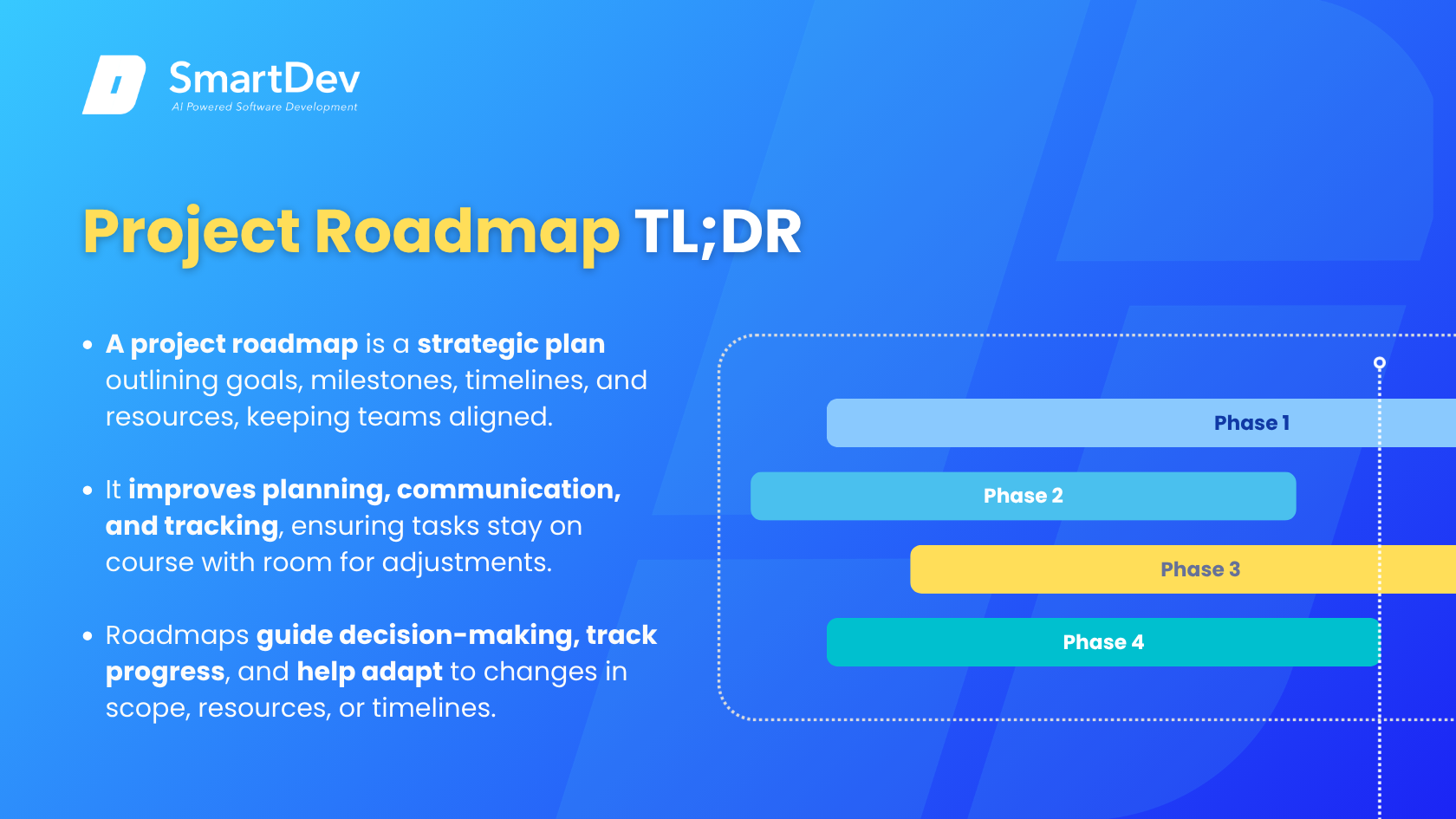 - Roadmaps guide decision-making, facilitate real-time tracking, and keep the project on course by accommodating changes in resources, scope, or timelines.