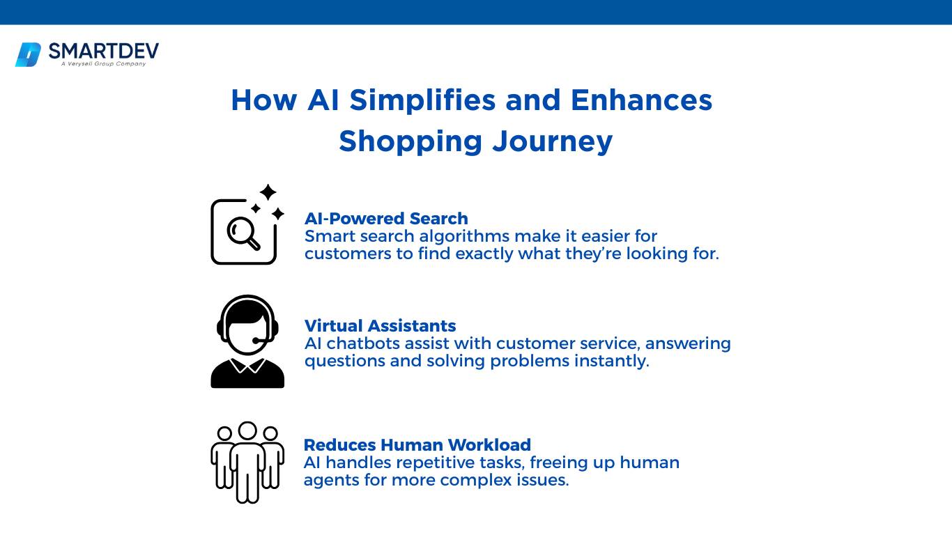 AI doesn’t just improve personalization – it also simplifies and enhances the overall shopping journey. From intelligent search functionalities to AI-powered virtual assistants, AI is helping businesses offer a seamless and intuitive experience.