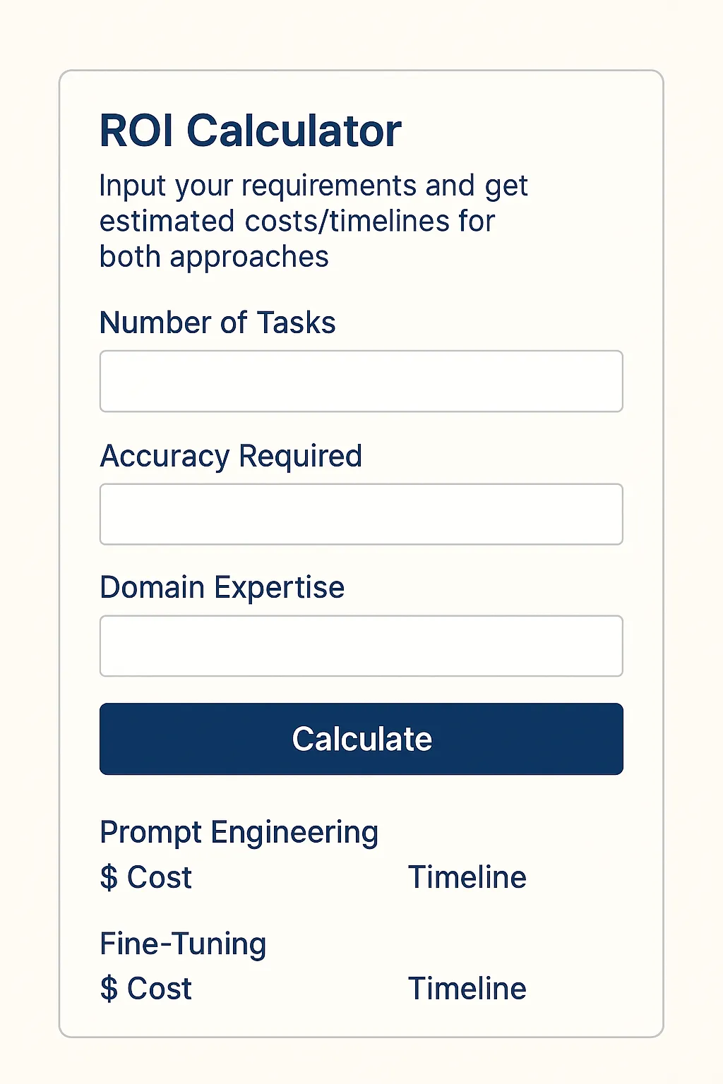 Progressive implementation reduces risk and accelerates ROI. Start with prompt engineering to establish baseline performance and validate use case viability. Collect real-world usage data and performance metrics to inform fine-tuning decisions. Migrate to fine-tuning only when clear ROI justification exists based on actual business impact.