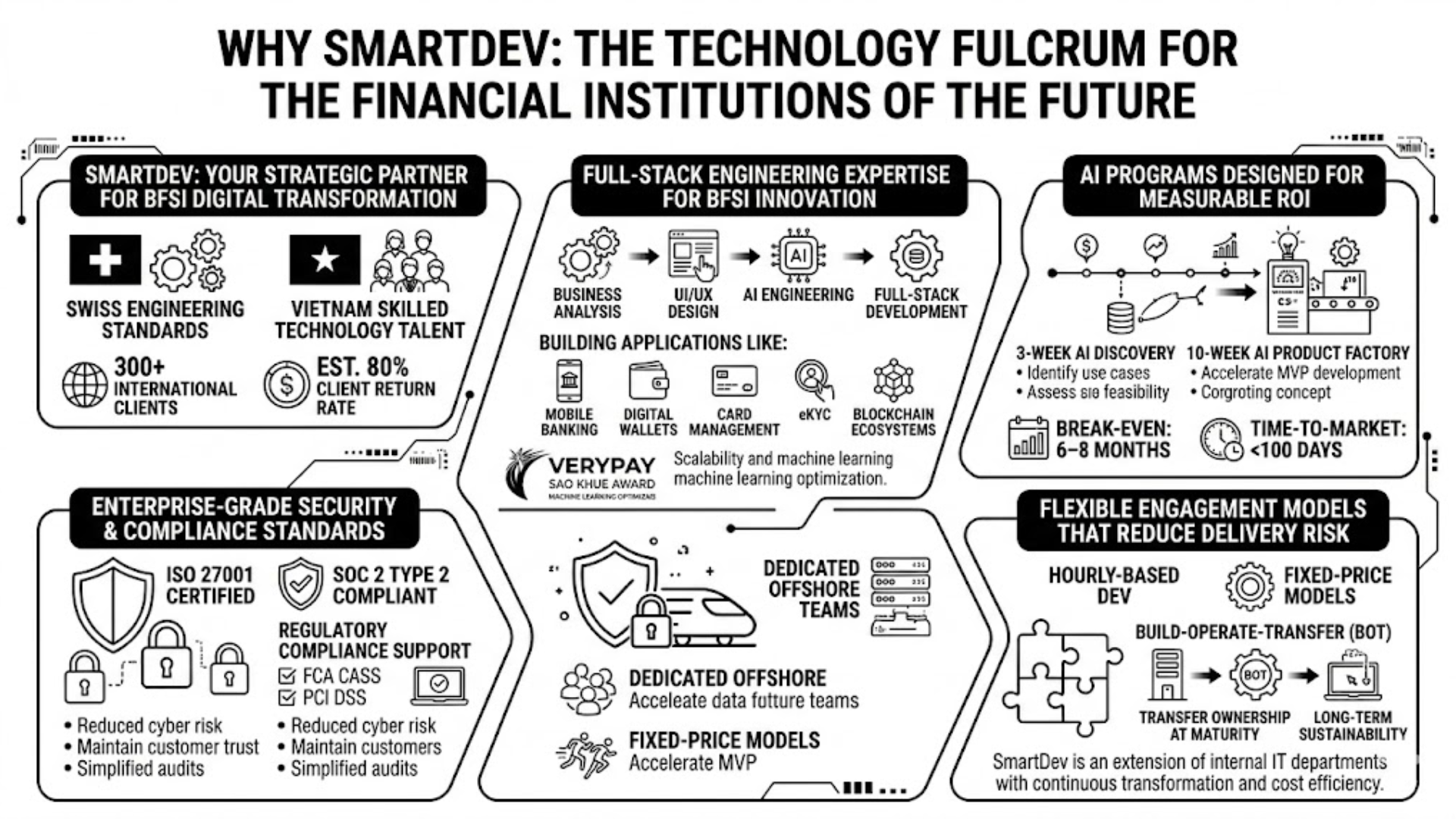 Founded in 2014 by Swiss entrepreneurs and now part of the Verysell Group, SmartDev operates global delivery centers in Vietnam (Da Nang and Hanoi). By combining Swiss-quality engineering standards with Vietnam’s highly skilled technology talent pool, SmartDev supports more than 300 international clients, achieving an estimated 80% client return rate. This positioning allows SmartDev to deliver scalable, high-performance solutions aligned with modern digital transformation for BFSI priorities.