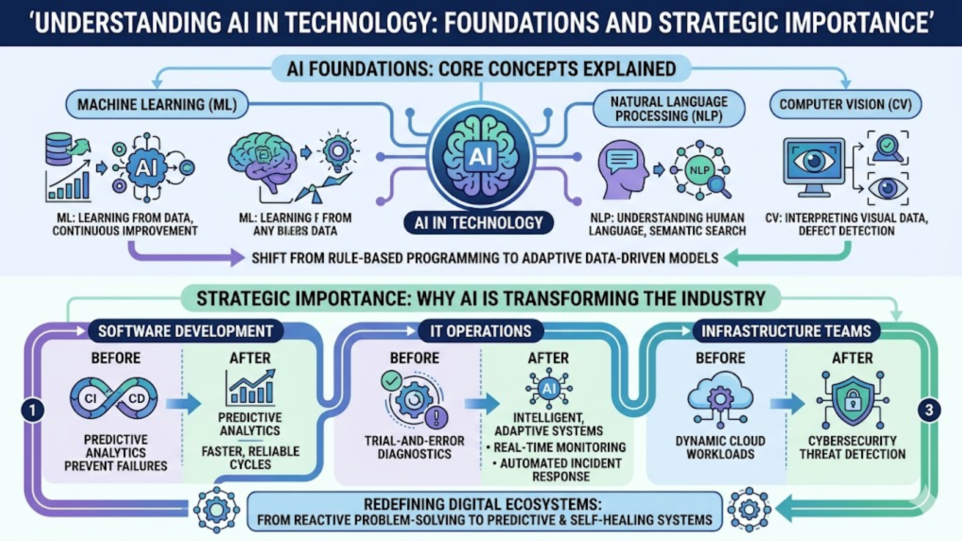 Moreover, infrastructure teams use AI in Technology to dynamically manage cloud workloads, detect cybersecurity threats, and predict hardware failures. Consequently, this shift allows organizations to move from reactive problem-solving to predictive and self-healing systems. In the long run, AI in Technology is not just improving efficiency, it is fundamentally redefining how digital ecosystems are designed, built, and managed.