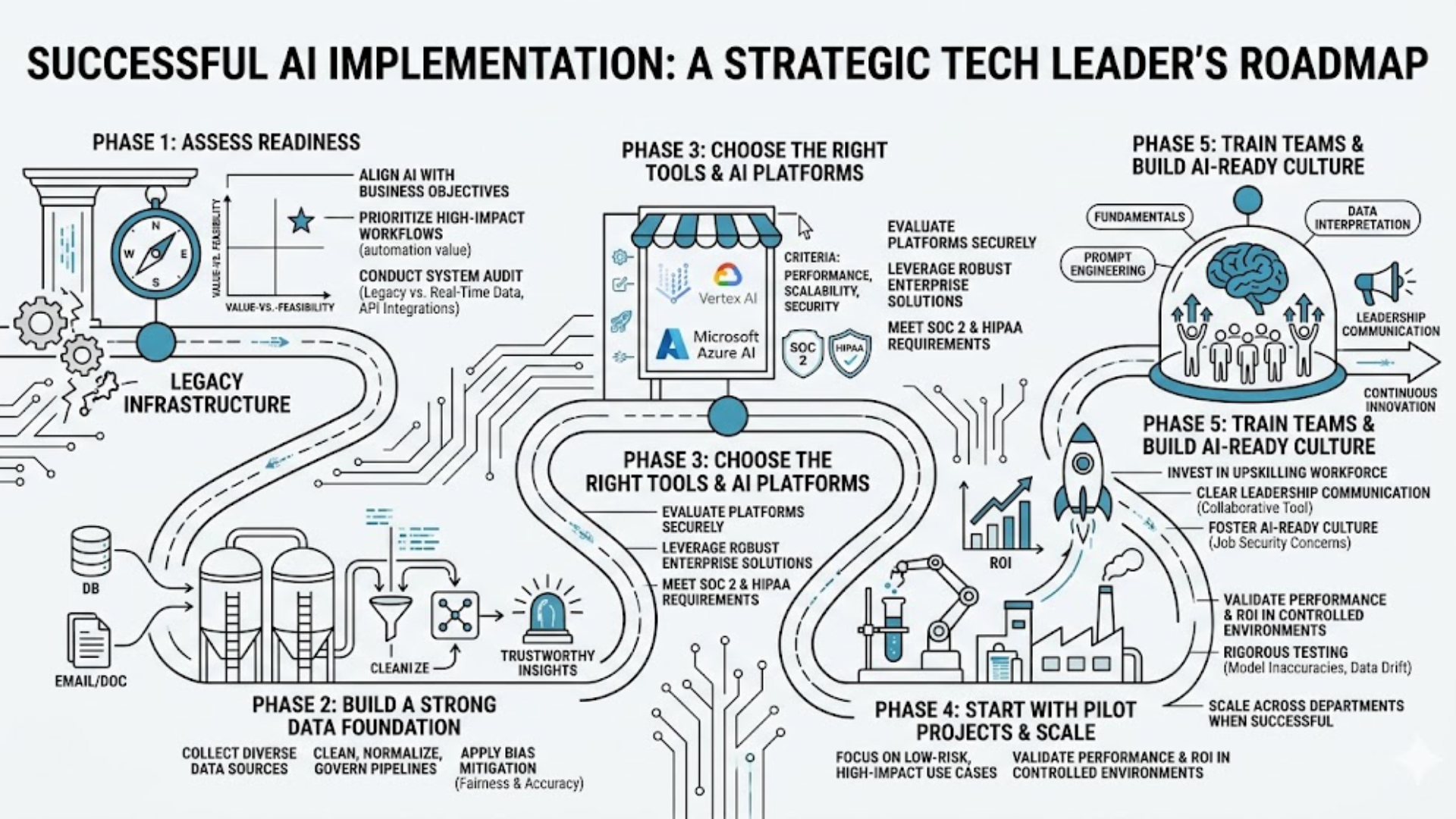 Implementing AI in Technology requires a structured, strategic approach rather than isolated experiments. Therefore, organizations must follow a clear roadmap to ensure scalable, secure, and value-driven adoption. Below are the essential phases technology leaders should prioritize.