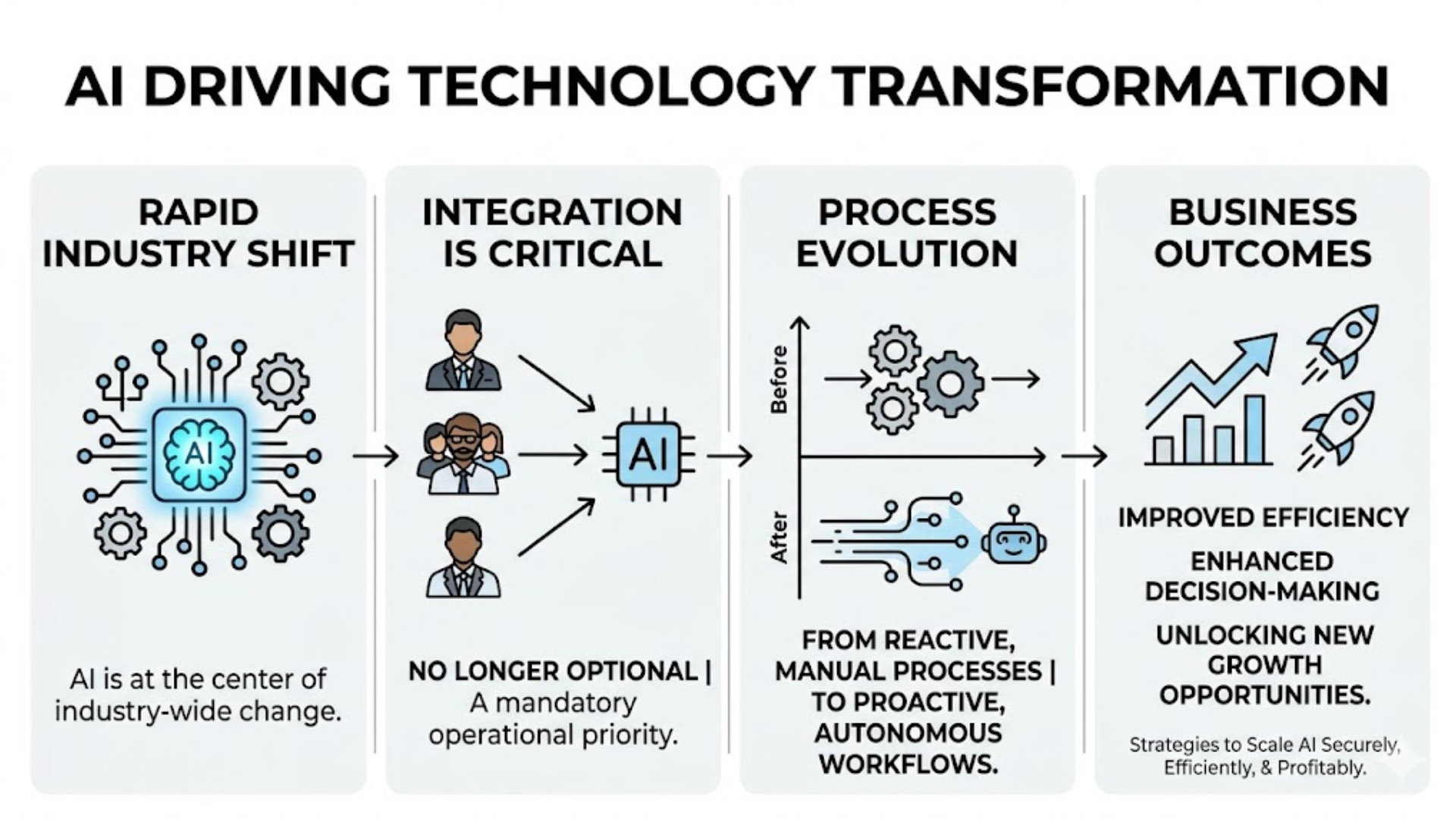 To remain competitive, organizations must take a proactive approach to AI in Technology adoption. First, they should build flexible and scalable digital infrastructures. In particular, adopting API-first architectures allows seamless integration of new AI models as they emerge.