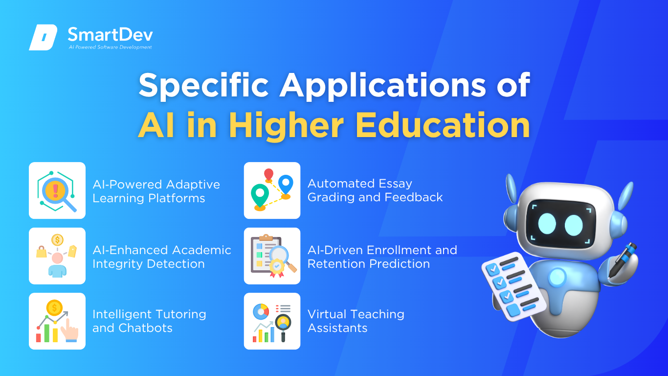 In higher education, AI applications range from personalized learning tools and intelligent tutoring systems to predictive analytics for student retention and automated administrative workflows. These technologies enable institutions to deliver higher quality education, streamline operations, and enhance student support.