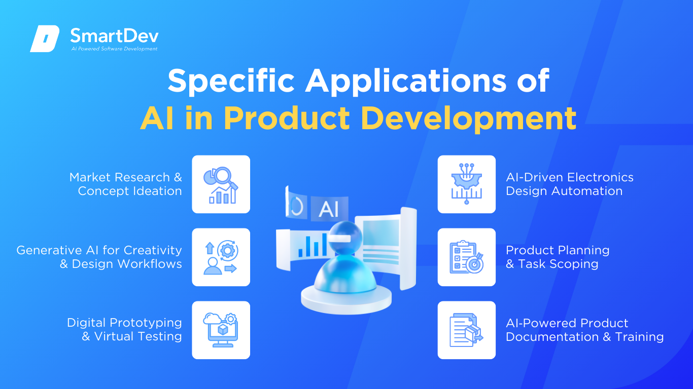 In product development, AI is applied to enhance every stage of the lifecycle – from idea generation and design to testing and optimization. It helps teams analyze data, automate complex processes, and simulate outcomes with high accuracy. This integration enables faster decision-making, reduces manual effort, and supports more innovative, user-centric product solutions.