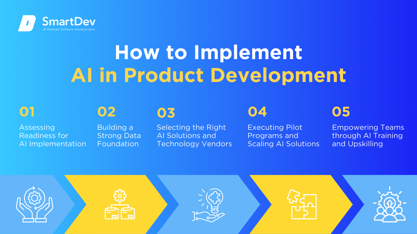 Implementing AI in product development requires a strategic approach that combines readiness assessment, data preparation, and the right tools to maximize its impact. By following a structured process, organizations can successfully integrate AI to enhance efficiency, innovation, and overall product quality.
