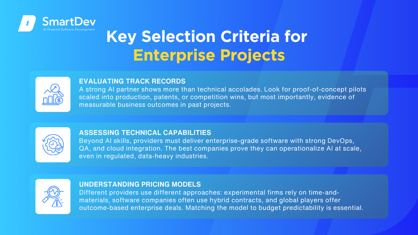 Enterprises must align their specific project goals—whether it’s innovation, scalability, or seamless integration—with the capabilities of their chosen partner. Clear selection criteria, such as assessing technical capabilities, evaluating track records, and understanding pricing models, will ensure that the right partner is chosen to support successful AI implementation.