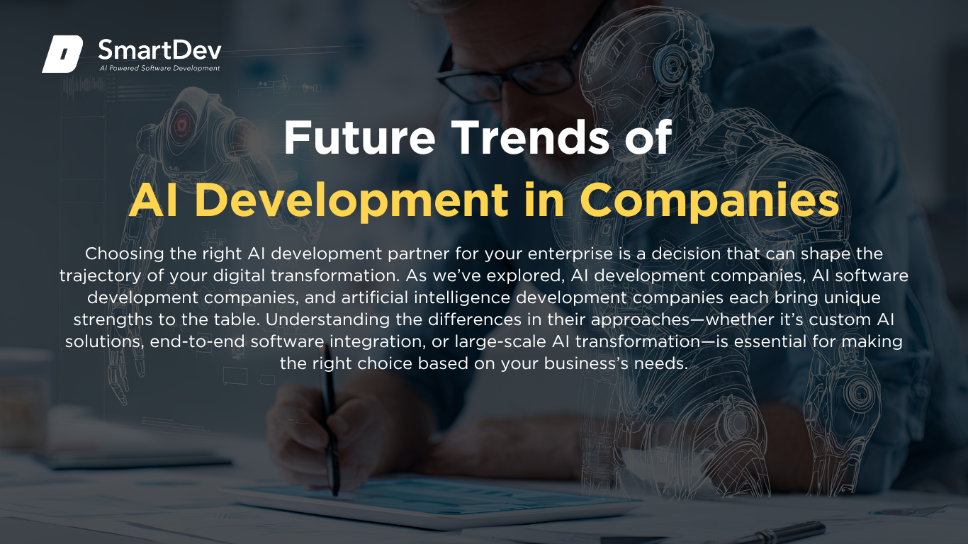 Choosing the right AI development partner for your enterprise is a decision that can shape the trajectory of your digital transformation. As we’ve explored, AI development companies, AI software development companies, and artificial intelligence development companies each bring unique strengths to the table. Understanding the differences in their approaches—whether it’s custom AI solutions, end-to-end software integration, or large-scale AI transformation—is essential for making the right choice based on your business’s needs.