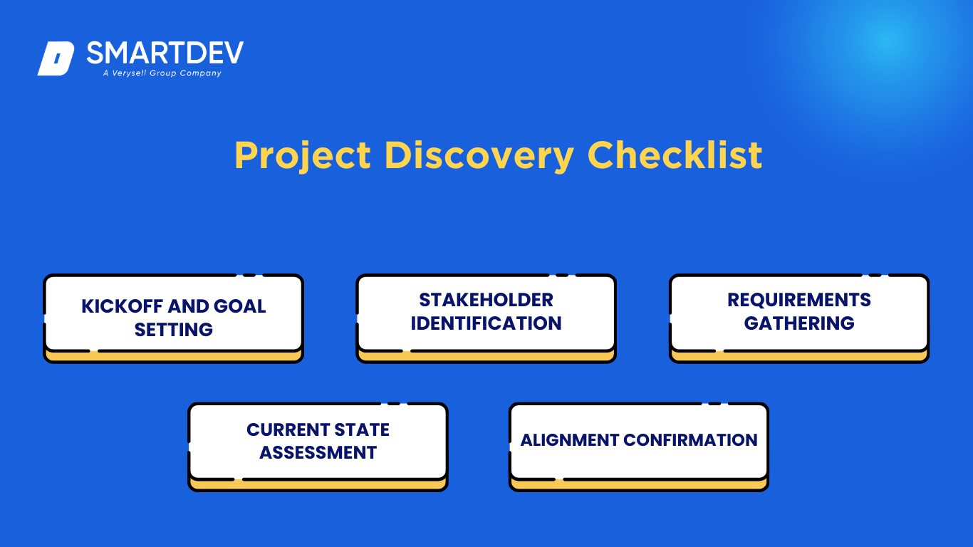 A project discovery checklist is essential for maintaining focus and ensuring that all necessary steps are taken during the product discovery phase. Here’s what we include in our checklist to guarantee alignment in the first week: