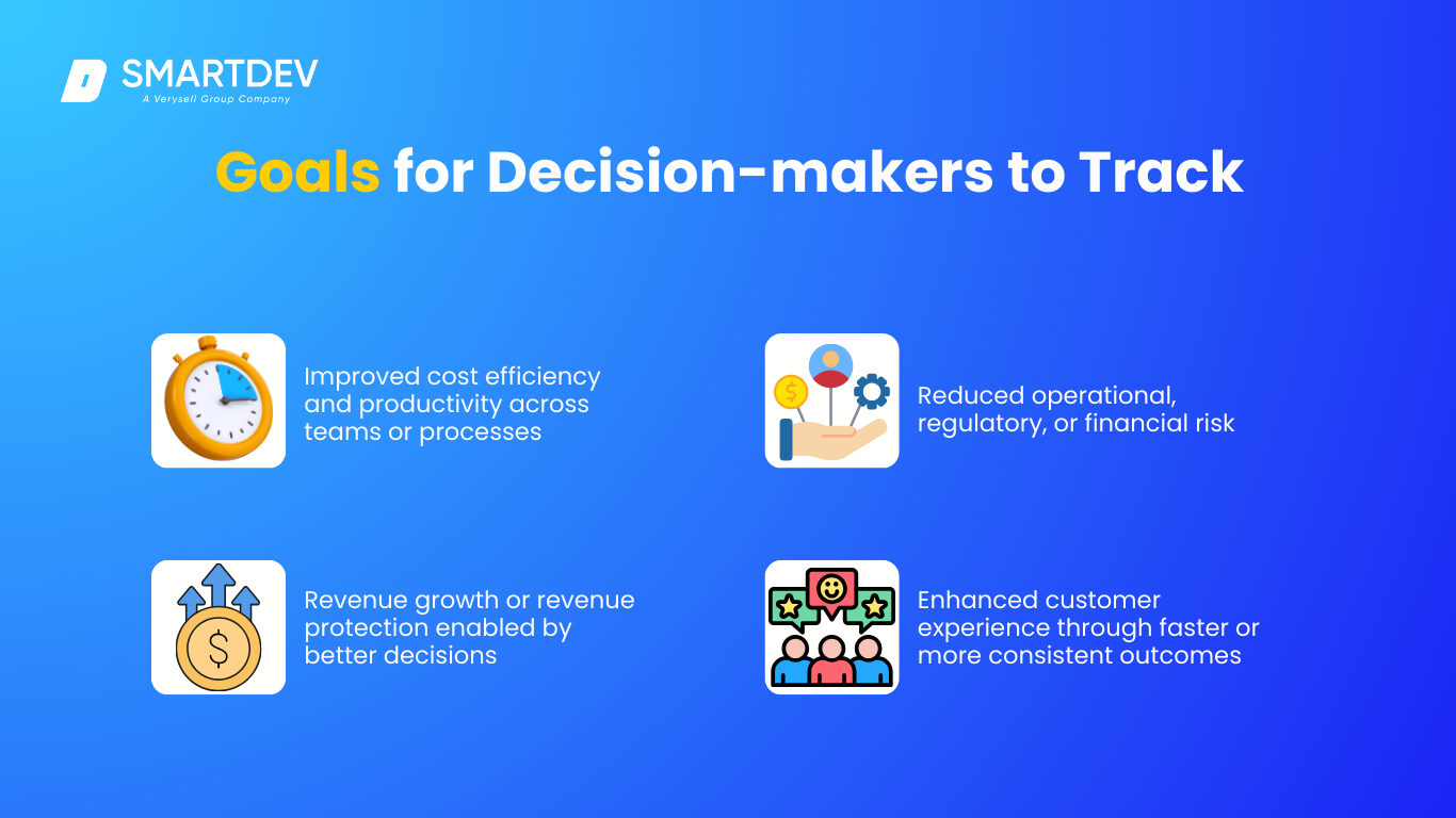 • Define AI business impact metrics tied to cost reduction, efficiency, or revenue