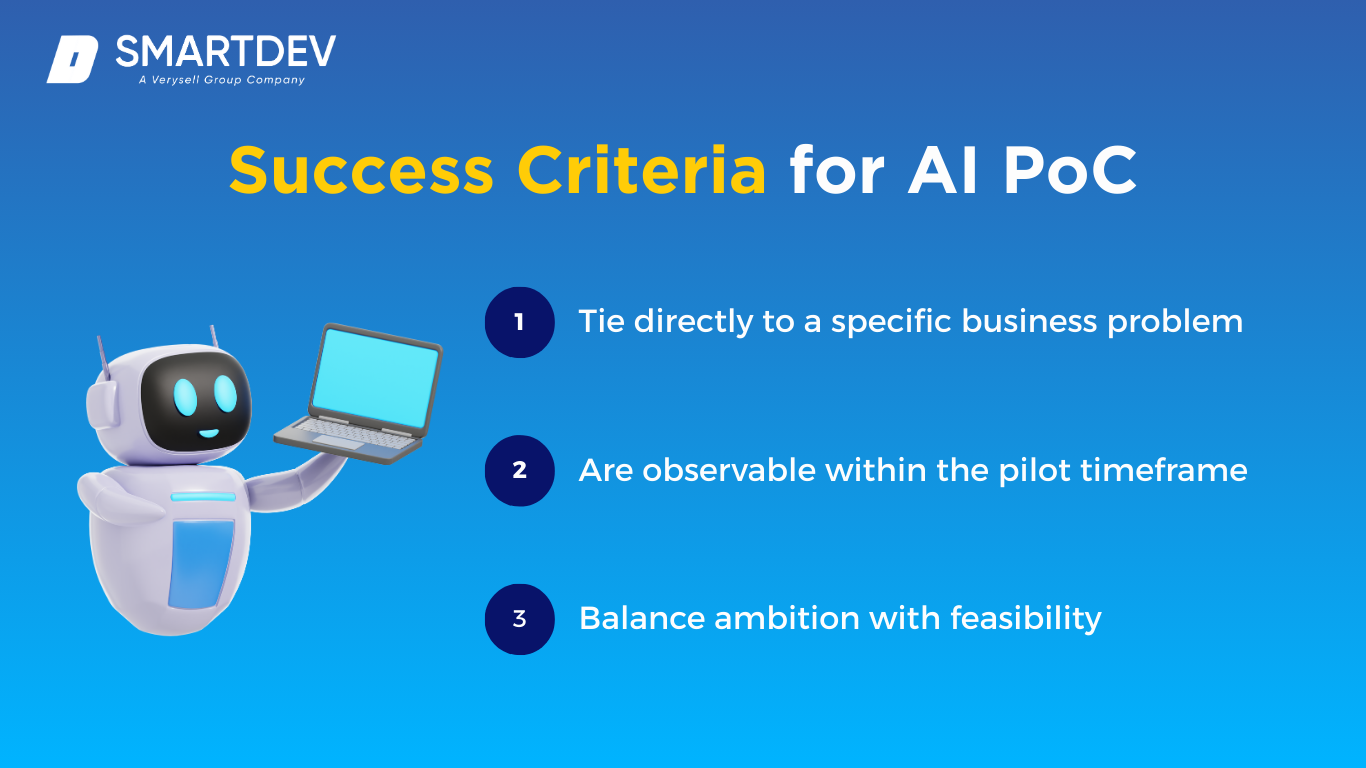 Clear success criteria are the foundation of credible AI proof of concept ROI. Without them, pilot results are hard to interpret and easy to dispute. Defining success upfront ensures all stakeholders evaluate outcomes using the same standards.