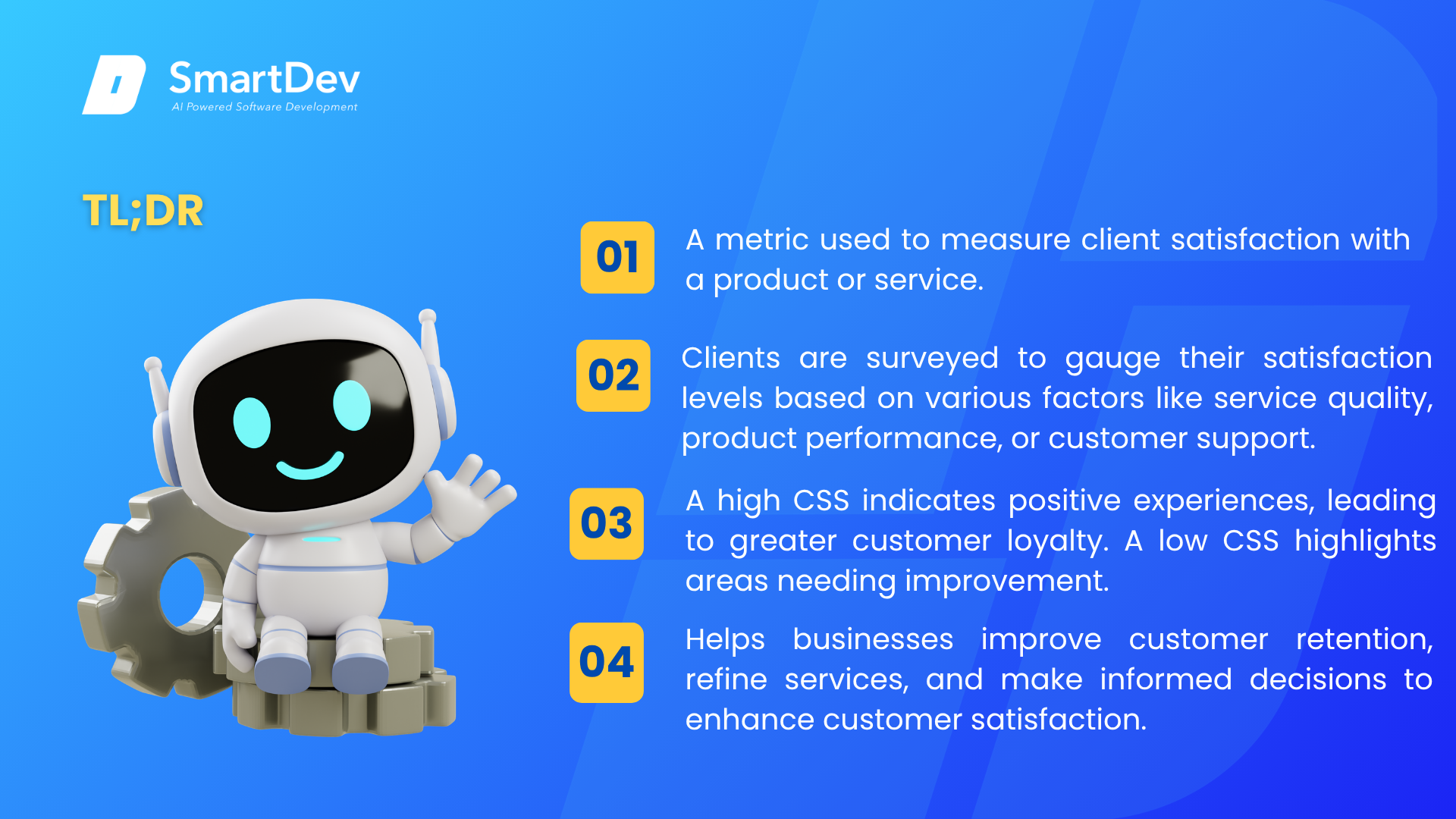 - A high CSS indicates positive experiences, leading to greater customer loyalty. A low CSS highlights areas needing improvement.