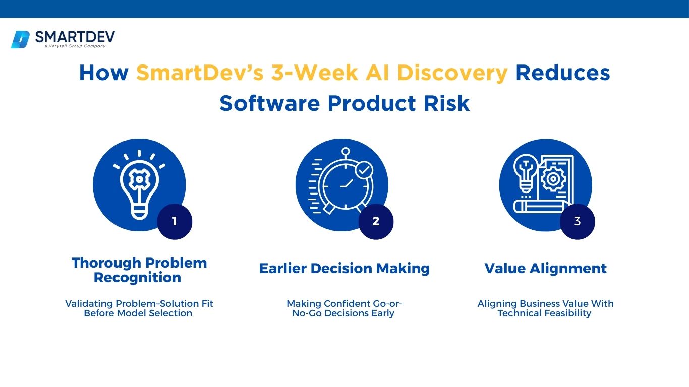 AI product risk builds up long before development starts. It appears when problems are poorly defined, assumptions go untested, and teams move forward without alignment. SmartDev’s AI discovery is designed to eliminate these risks early. In just three weeks, it brings together business discovery, technical insight, and structured planning to replace uncertainty with clarity before real costs are incurred.