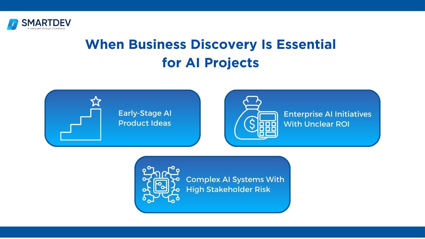 Business discovery is not a nice-to-have in AI initiatives. It becomes essential whenever uncertainty around value, feasibility, or alignment is high. AI introduces more unknowns than traditional software, from data readiness to organizational impact. Without early discovery, teams often move fast in the wrong direction. A structured AI discovery phase reduces software product risk by replacing assumptions with validated insights before development begins.