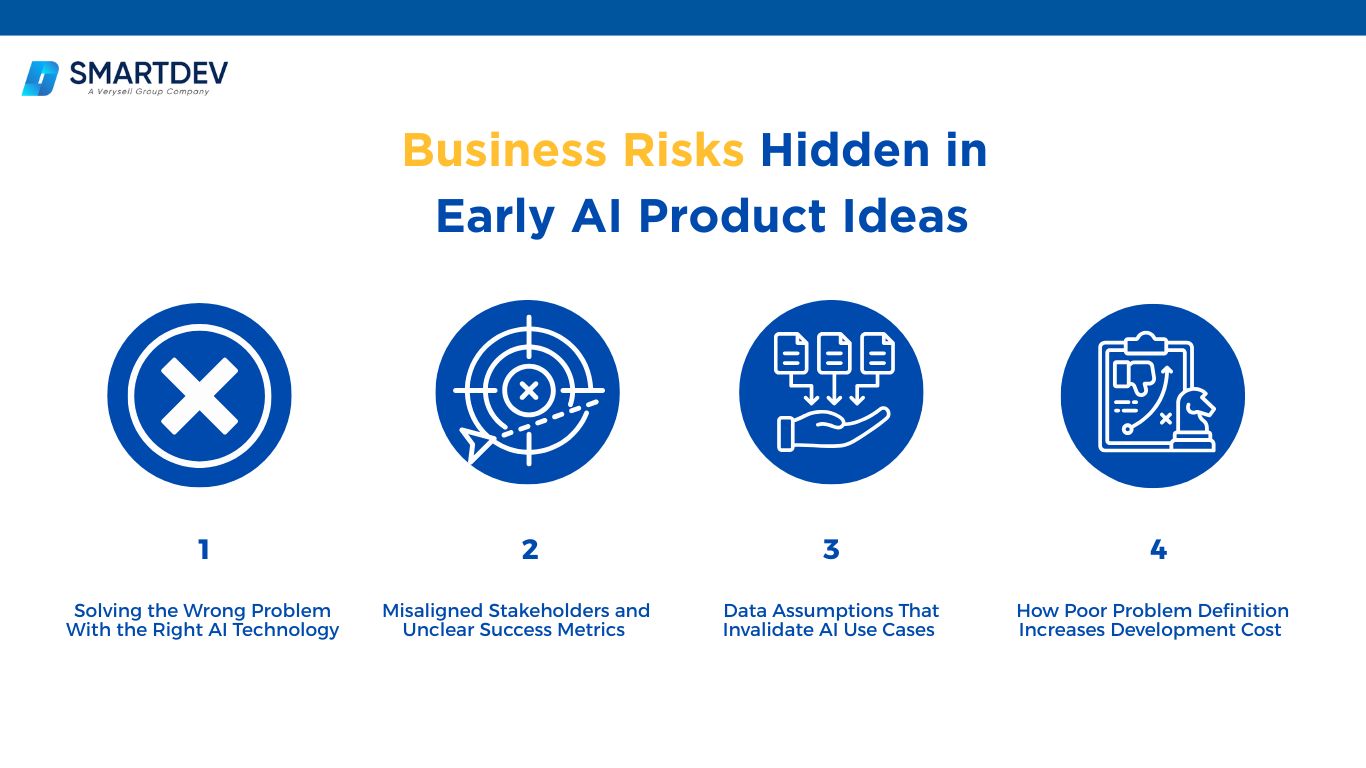 Early AI product ideas often look promising on the surface. However, without structured AI discovery, many hidden business risks remain undetected until development is already underway. These risks rarely come from algorithms or tools. Instead, they originate from weak problem definition, misalignment, and assumptions that are never validated. Identifying these issues early is a core goal of business discovery and problem finding.