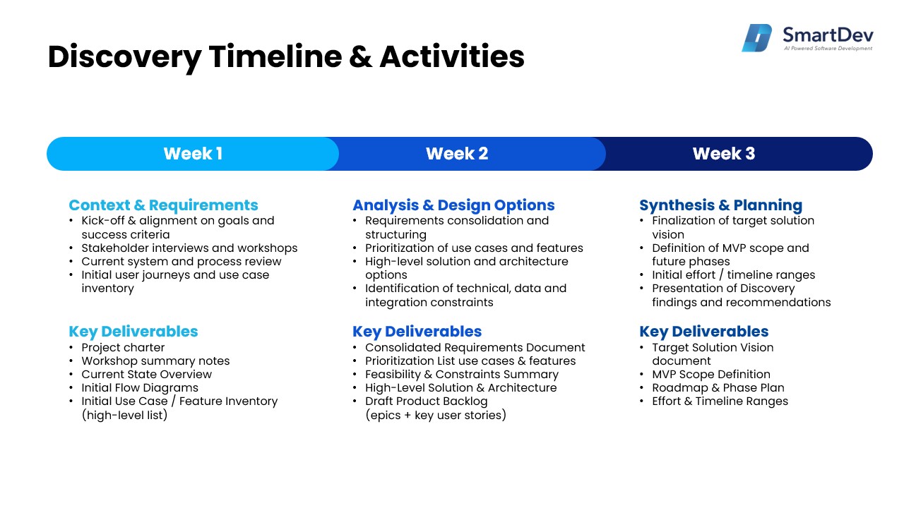 Start Your 3-Week Discovery Program NowSmartDev’s 3-Week AI Discovery. A Business-First Approach