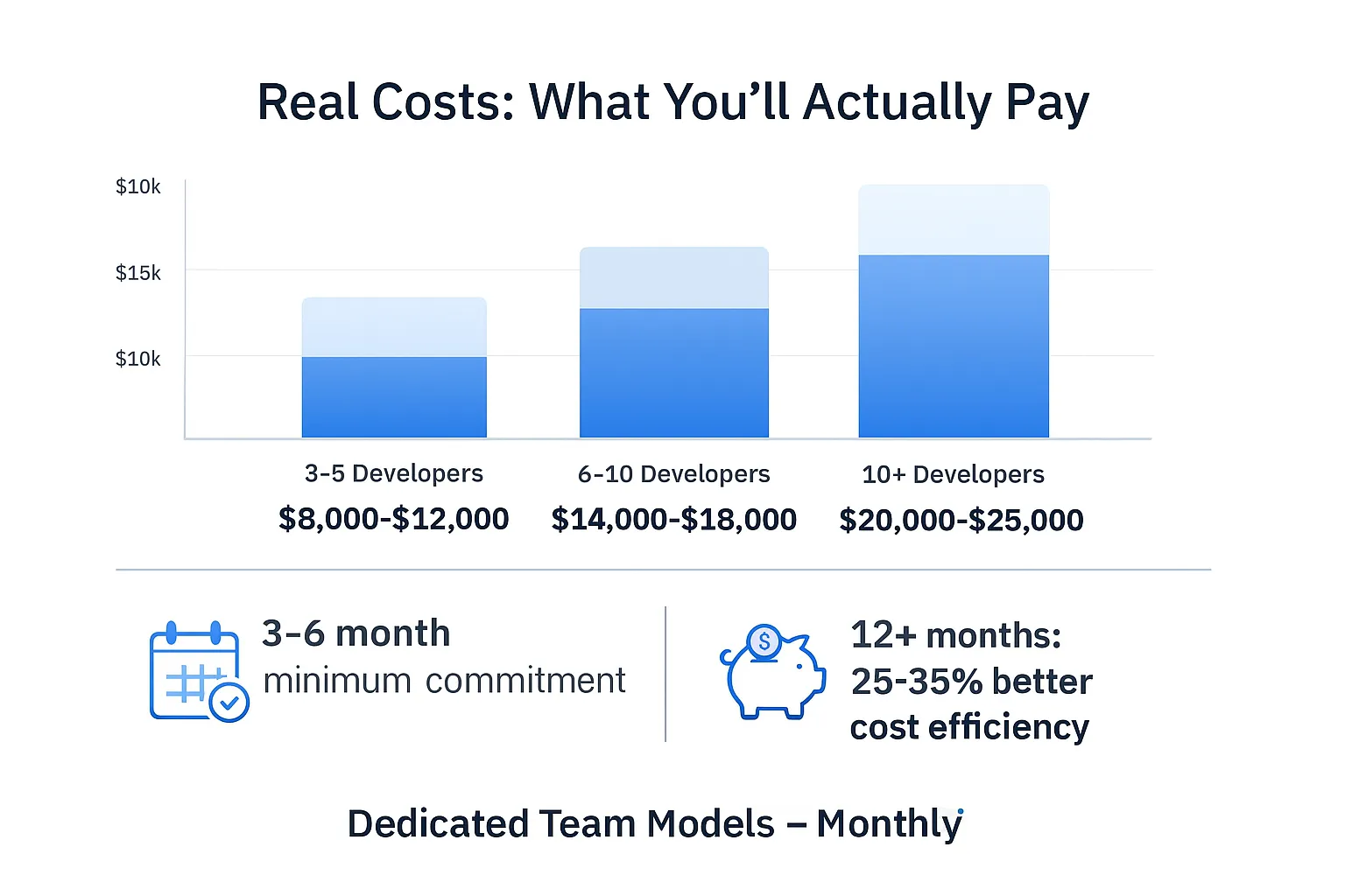 Dedicated teams typically require 3-6 month minimum commitments for optimal ROI, with monthly costs ranging from $8,000-$25,000 depending on team size and expertise level. Senior developers and specialized roles command premium rates, but overall costs remain 40-60% below equivalent US hiring.