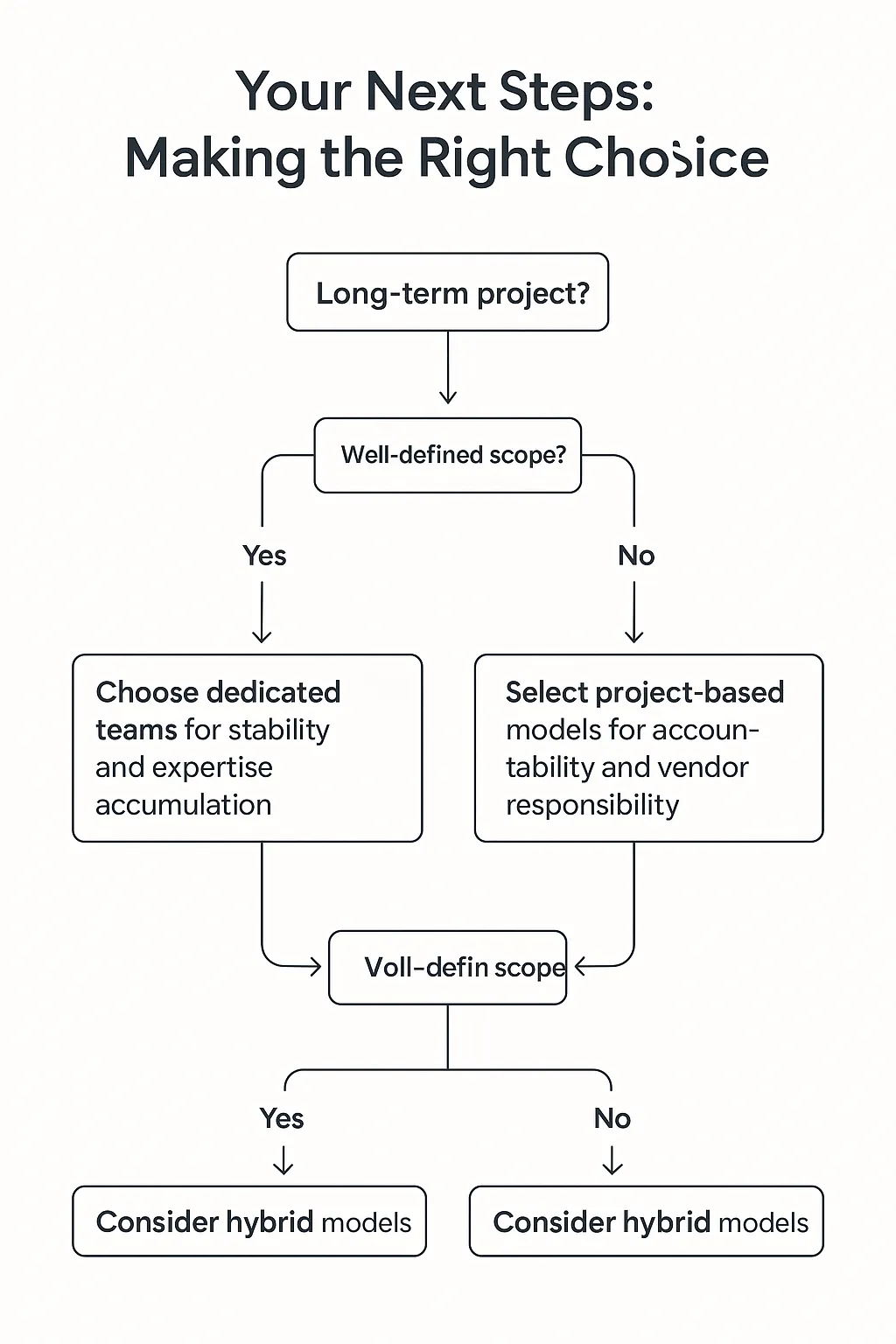 For well-defined projects with fixed scope → Select project-based models for accountability and vendor responsibility. Clear requirements and stable budgets align perfectly with contract-based engagement structures.