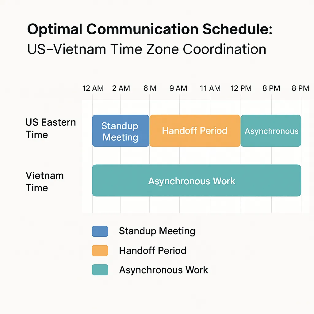 The 12-hour time difference between Vietnam and the US East Coast actually becomes an advantage when properly managed. Vietnamese teams can review code and provide feedback while your US team sleeps, creating a “follow the sun” development cycle.