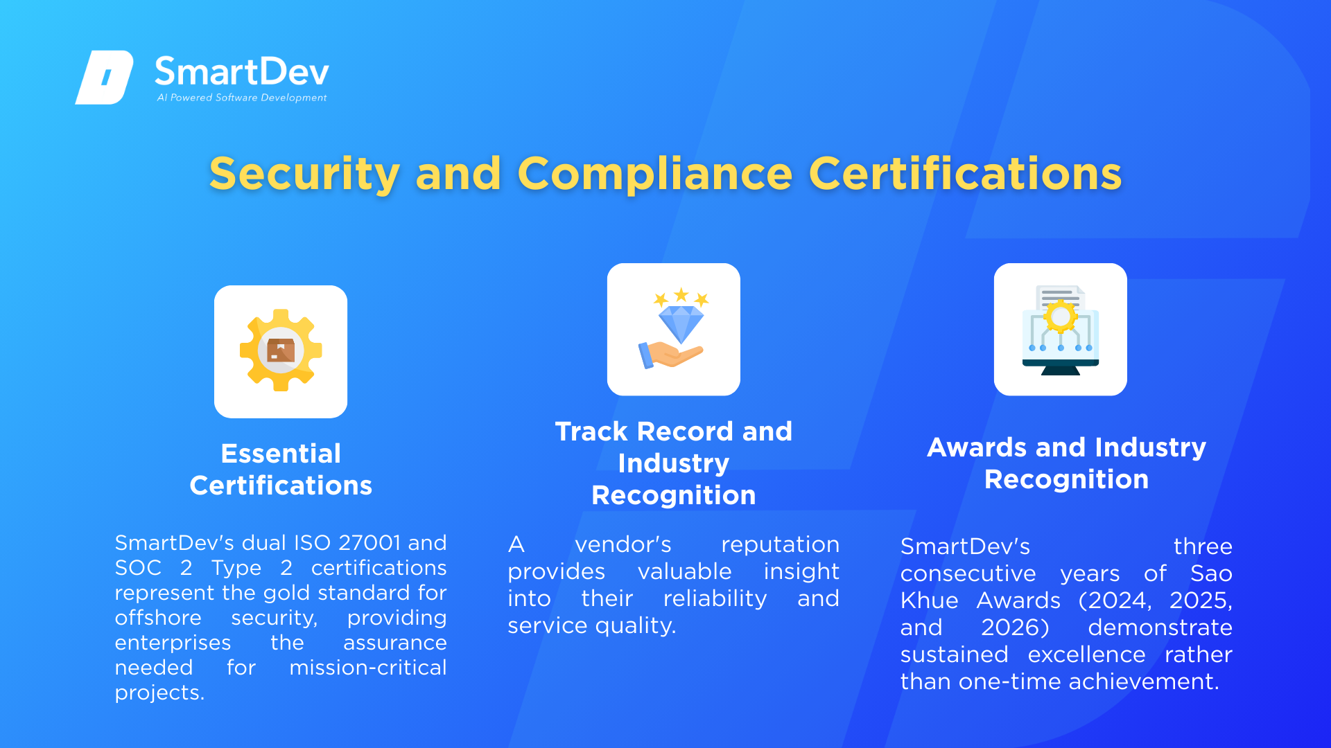 SmartDev’s dual ISO 27001 and SOC 2 Type 2 certifications represent the gold standard for offshore security, providing enterprises the assurance needed for mission-critical projects. These certifications require rigorous audits of security practices, data handling procedures, and operational controls—filtering out vendors with inadequate security postures.