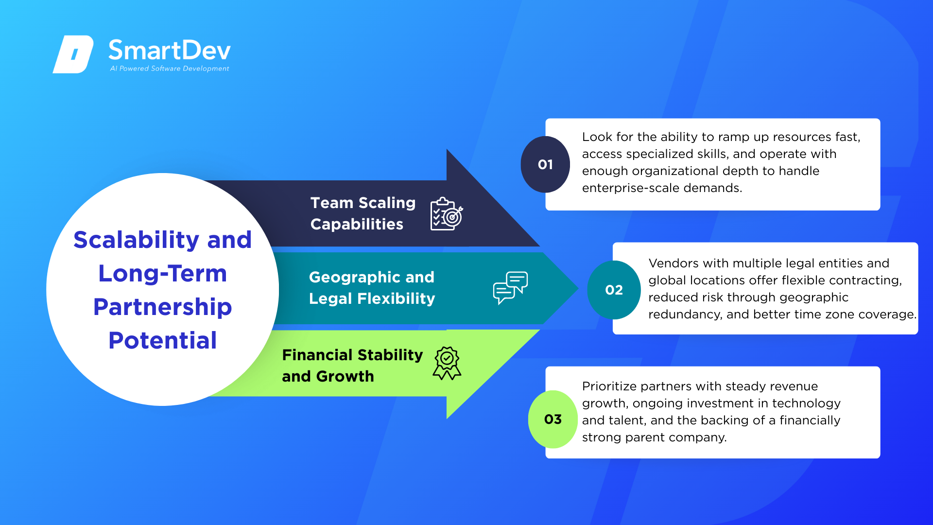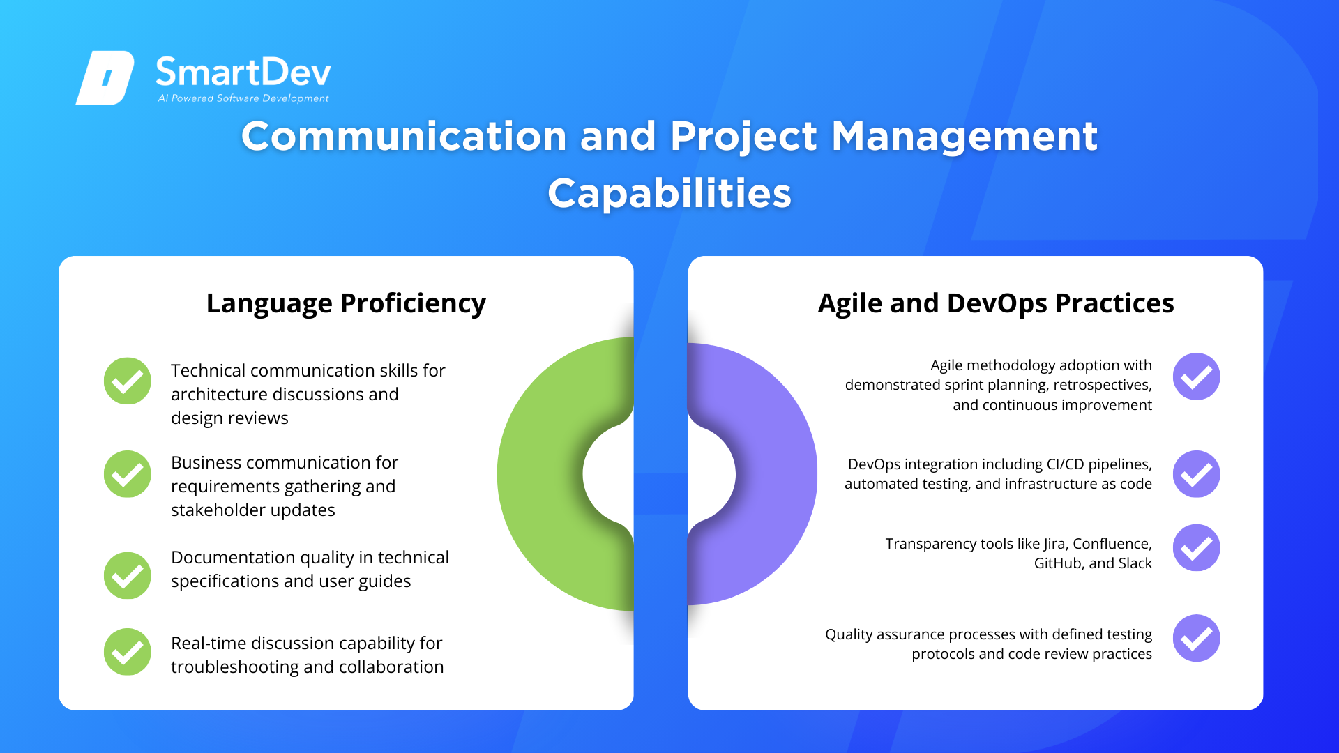 Leading vendors like SmartDev maintain 100% English-proficient engineering teams with certifications across multiple technology domains, ensuring seamless communication alongside technical excellence.