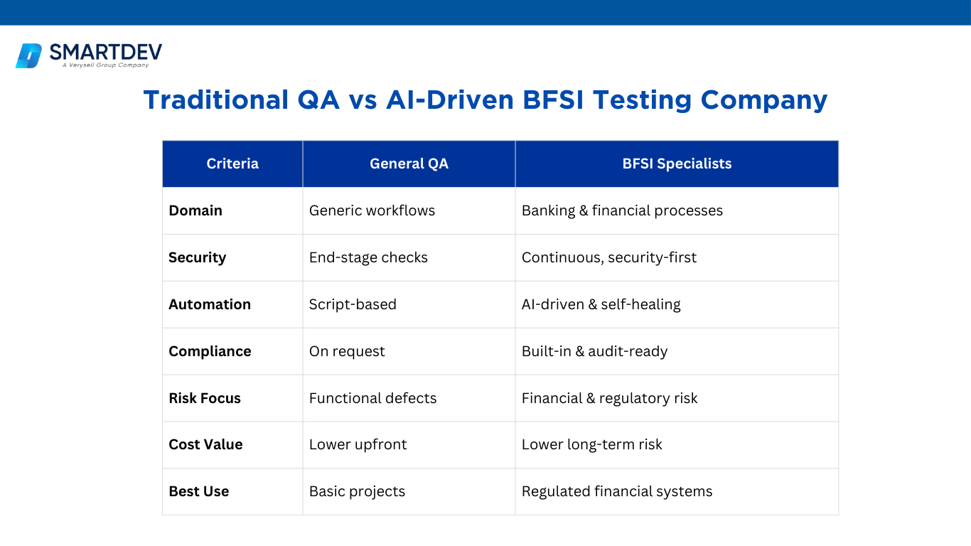Choosing the right BFSI testing company requires a structured comparison between general QA vendors and specialized financial domain testing partners. At first glance, both may appear capable of delivering functional validation and regression testing. However, when financial data security, regulatory compliance, and system resilience are at stake, the differences become substantial. The following comparison outlines how each type of provider approaches industry knowledge, security, automation, compliance, and cost structure.