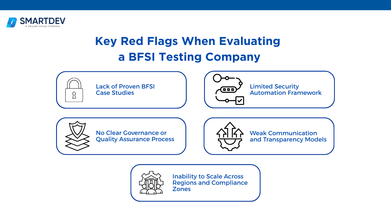 Selecting the right BFSI testing company requires careful due diligence. While many vendors claim industry expertise, certain warning signs indicate potential risks that could compromise security, compliance, and long-term stability. Identifying these red flags early helps financial institutions avoid costly missteps.