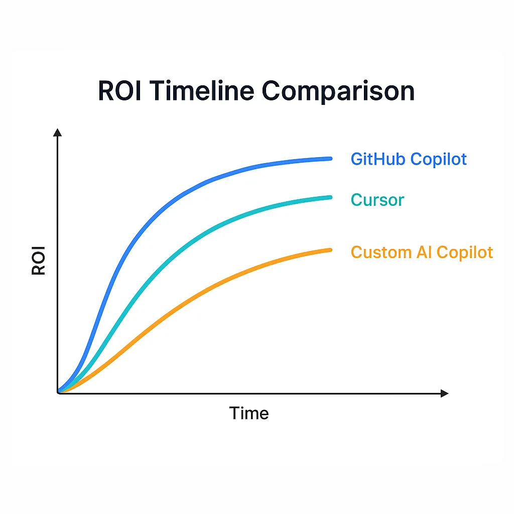 Fig1. ROI timeline comparison showing immediate gains (Copilot), medium-term payoff (Cursor), and long-term advantages (Custom)]