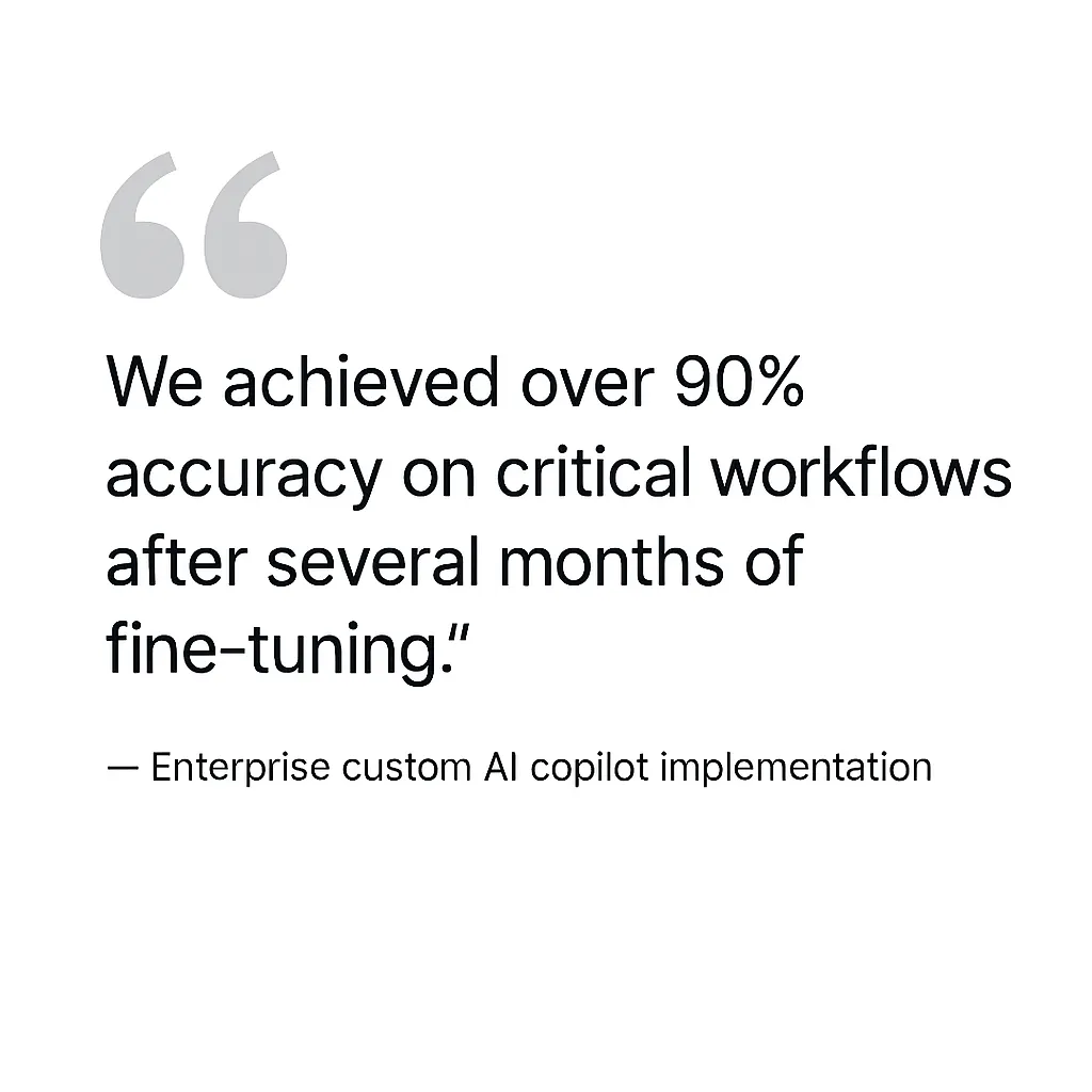 Custom copilots trained on proprietary datasets deliver 90%+ accuracy on domain-specific tasks after 4-6 months of tuning (SmartDev client reporting). This accuracy improvement comes from training on your actual codebase, understanding specific business logic and architectural patterns.