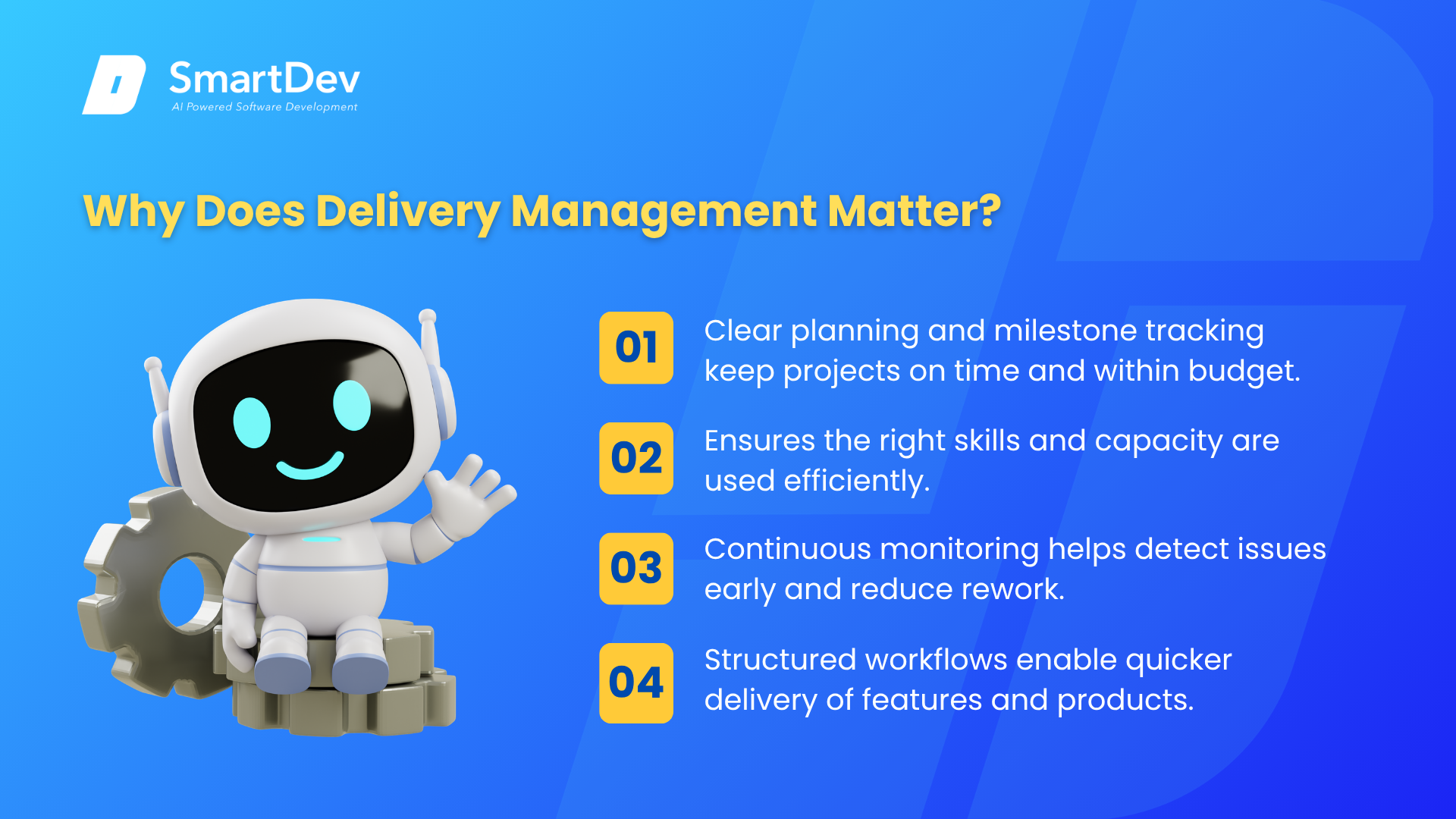 Without effective delivery management, projects may experience delays, unclear priorities, or misalignment between technical execution and business strategy. Strong delivery practices help organizations scale operations while maintaining consistency and performance.